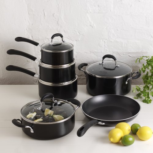 - Contains: 16cm/1.7L, 18cm/2.4L, 20cm/3.3L saucepans with lids, 28cm frying pan, 24cm/3.2L shallow casserole and 24cm/6.3L stockpot